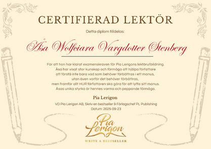 Hon är den perfekta lektören och coachen för dig som behöver tro på dig själv och som behöver någon som pekar på ditt manus alla styrkor, övertygad om att just DU kommer att lyckas. Självklart hjälper hon dig även att lyfta manuset så det blir ännu bättre.